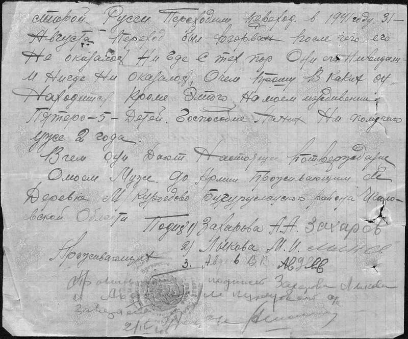 Последнее письмо от него отправленно 26.08.1941 г. По информации из военкомата. Содержание письма не известно.