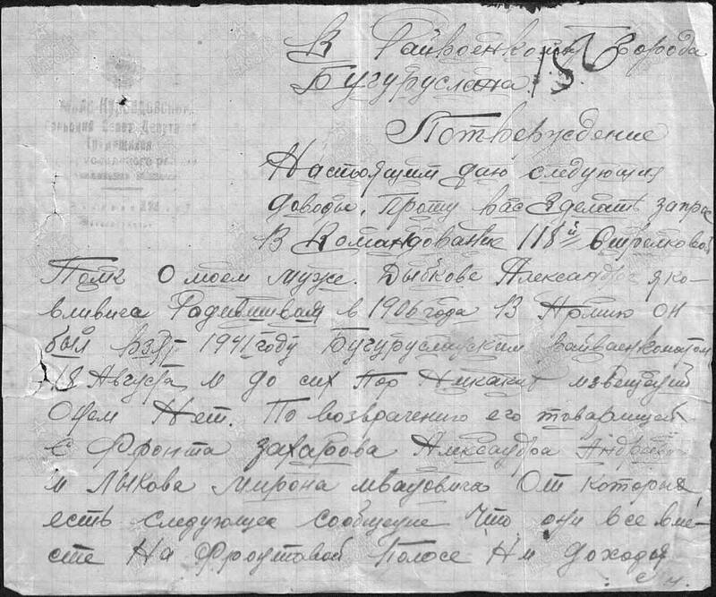 Дыбкова Наталья Филипповна в своем письме, просит сделать запрос в командование 118-ый стрелковый полк. (Информации о таком полку мне найти не удалось)