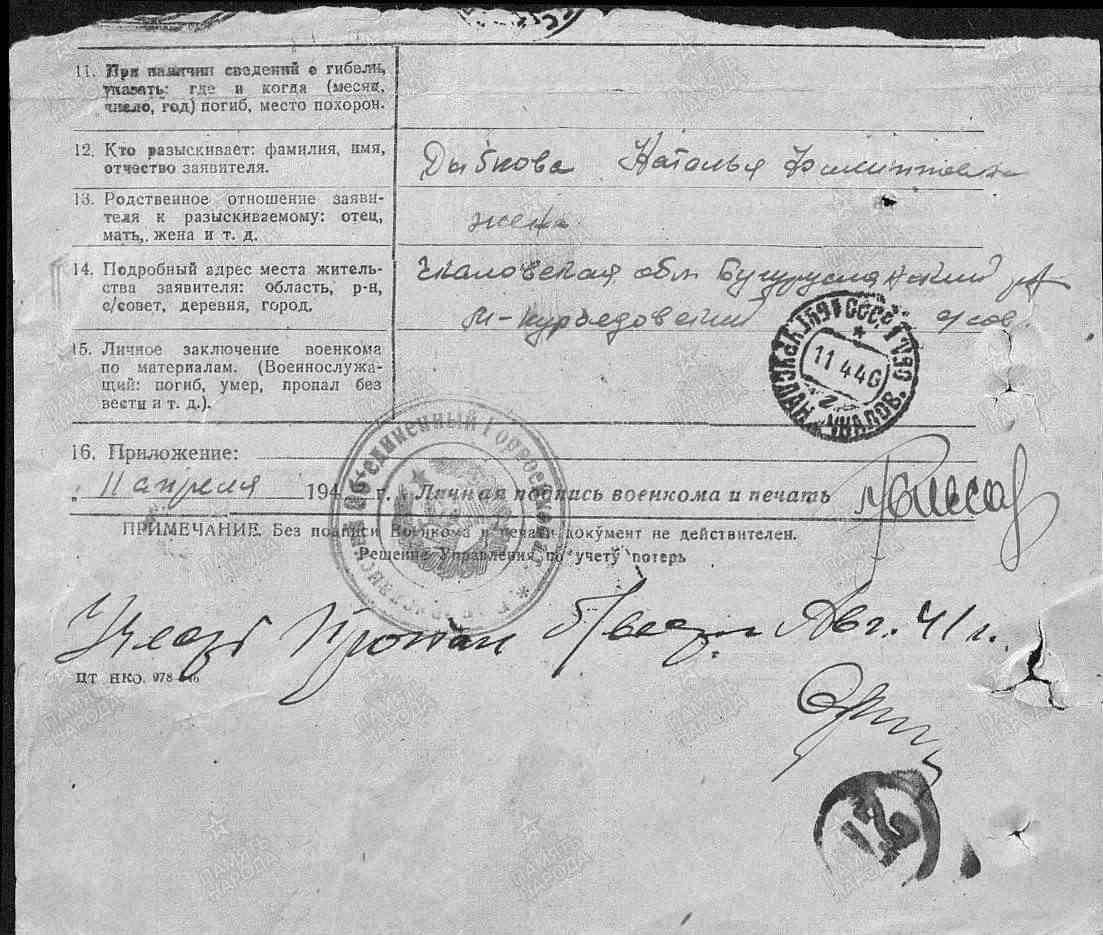 Причина выбытия: пропал без вести