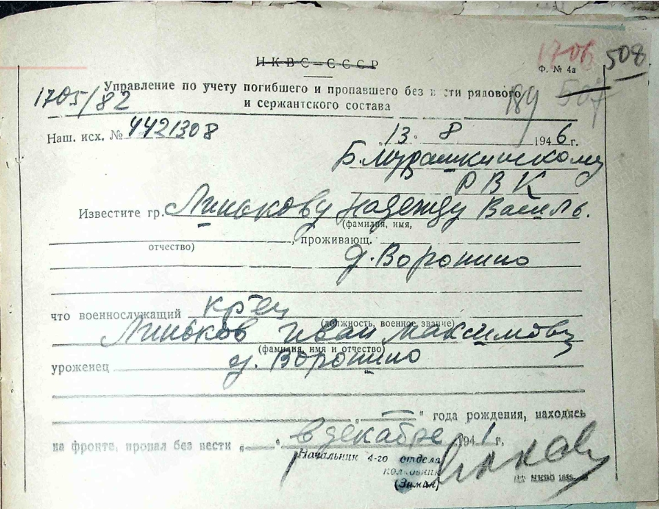 Извещение о пропаже б/в жене, Надежде Васильевне Линьковой, жила в д. Воронино.