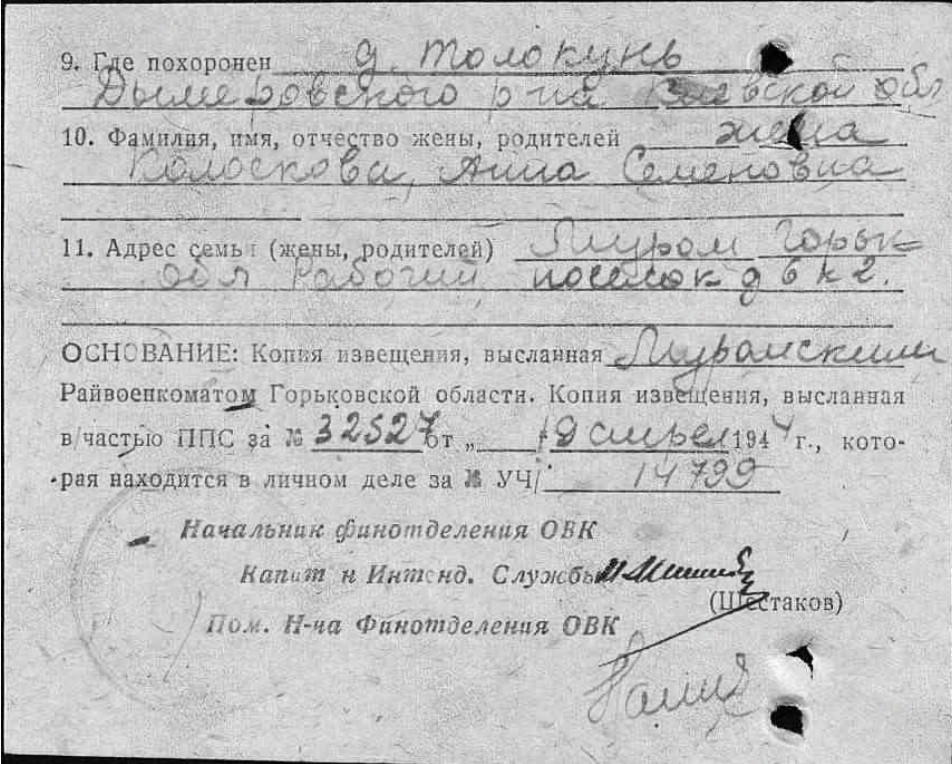 Командир роты 31 Гв. сп 9 Гв. сд, член ВКПб, жена Колоскова Анна Семёновна проживала в г. Муром.