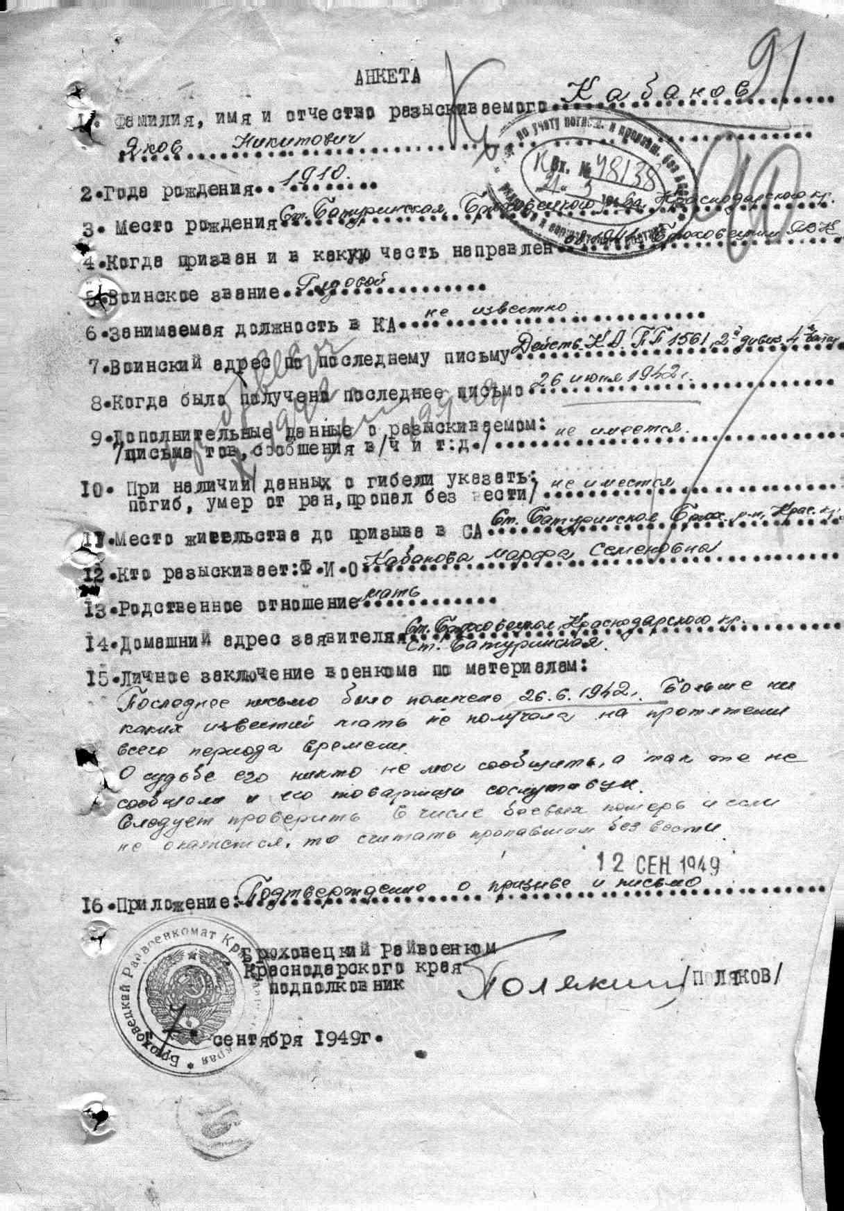 Дата призыва: __.08.1941 Брюховецкий РВК, Краснодарский край, Брюховецкий р-н