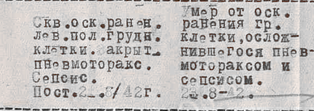 Был тяжело ранен 16 августа 1942 г. и отправлен в гопиталь
