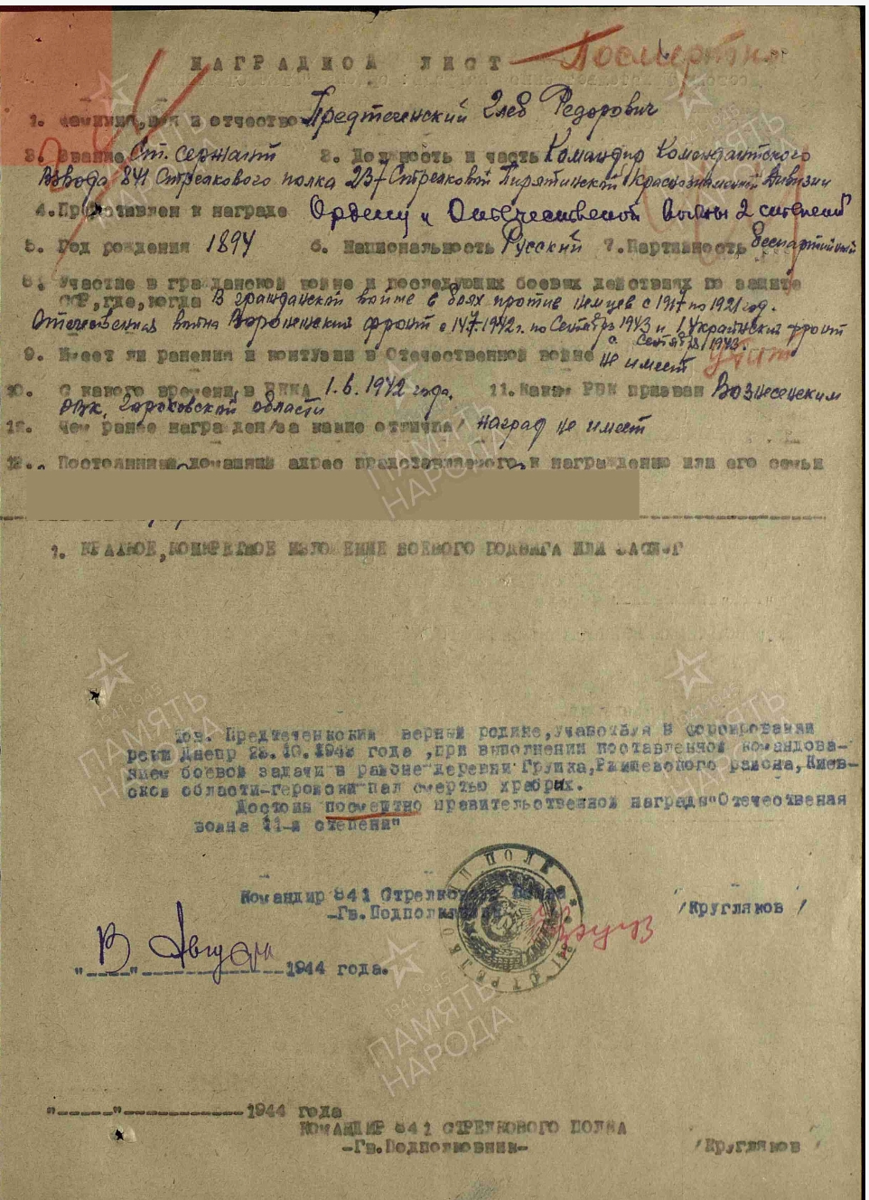 Наградной (посмертно)