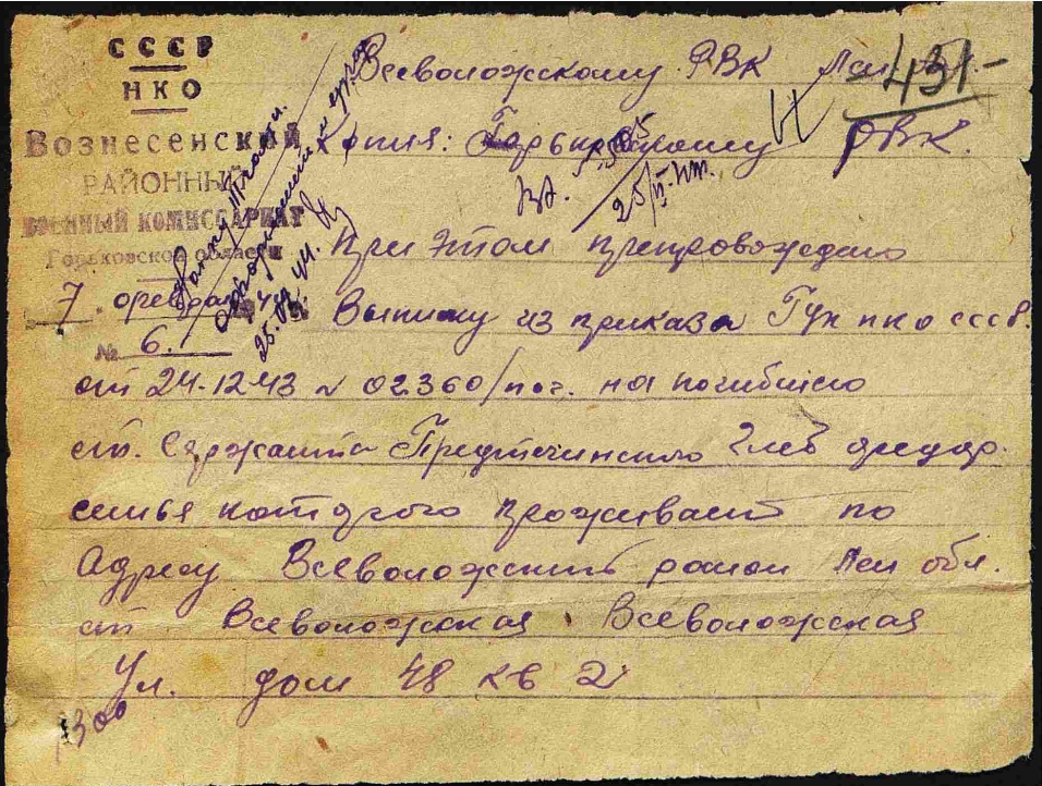 Место призыва: Вознесенский РВК, Горьковская обл., Вознесенский р-н