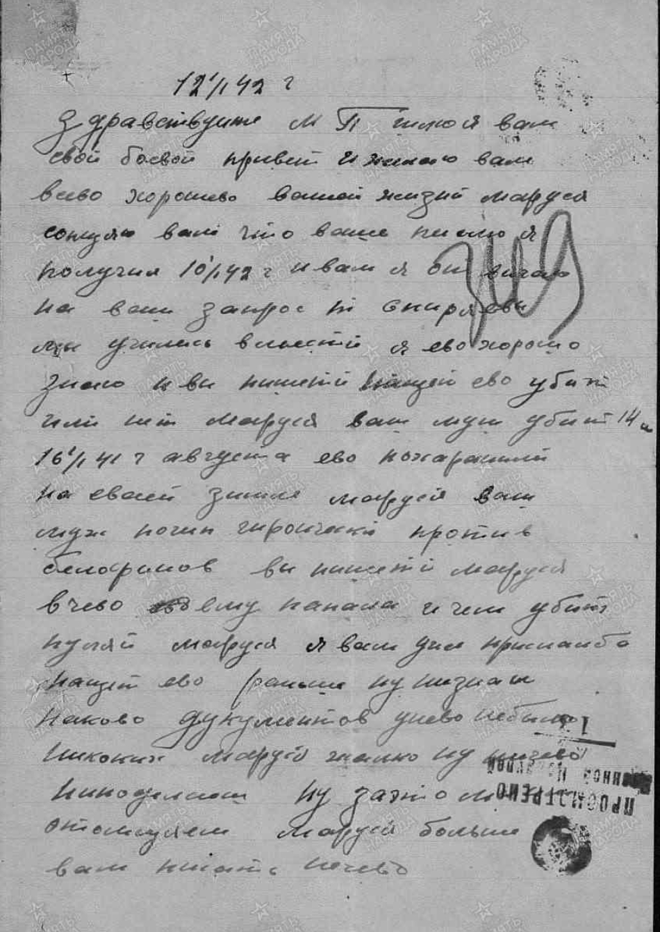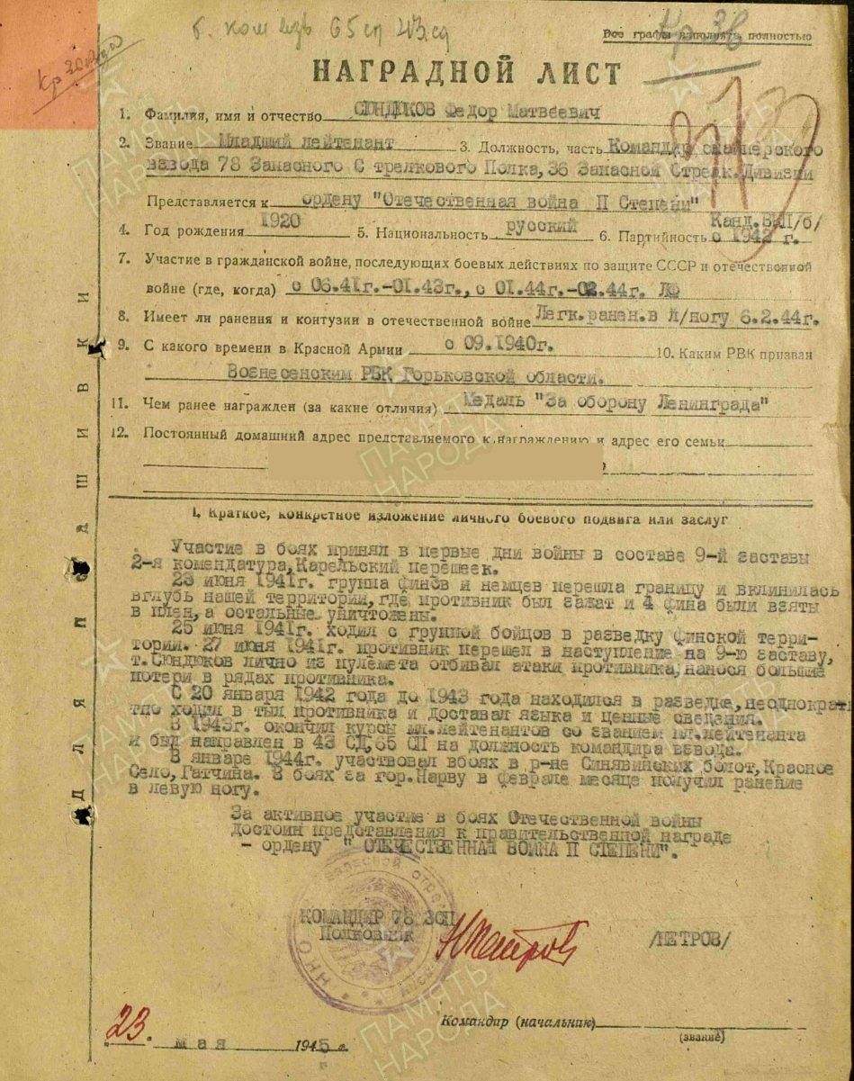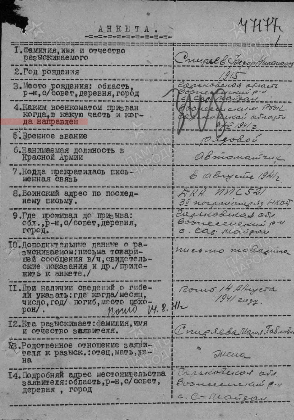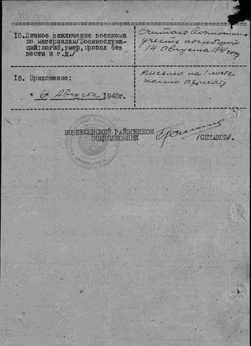 Дата призыва: 06.05.1941 Вознесенский РВК, Горьковская обл., Вознесенский р-н