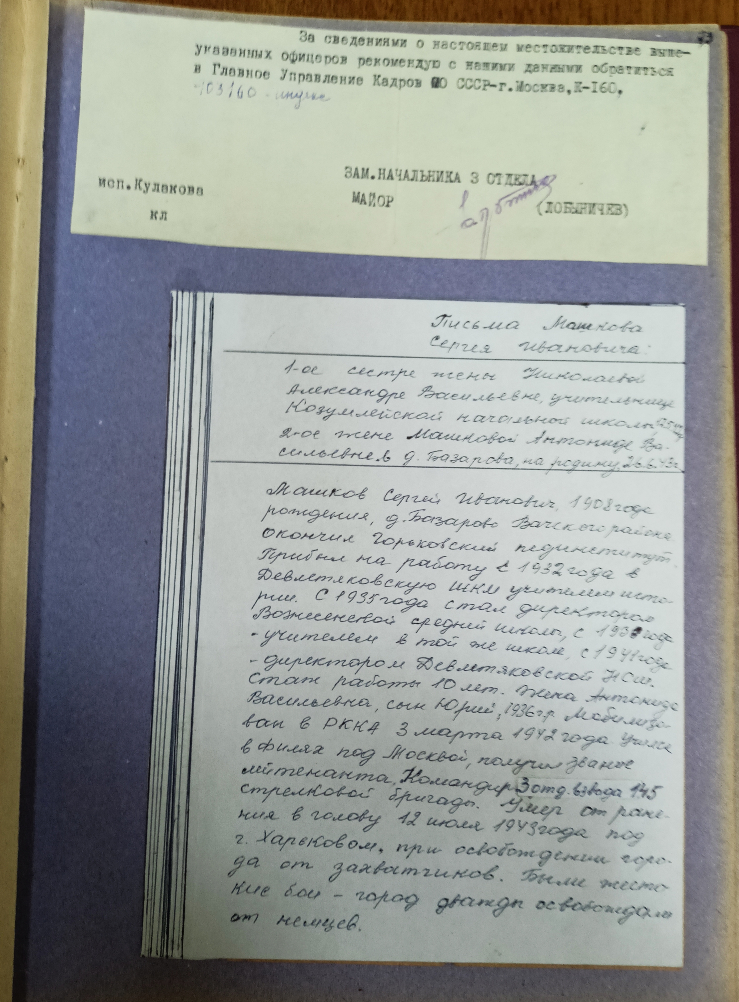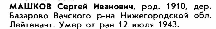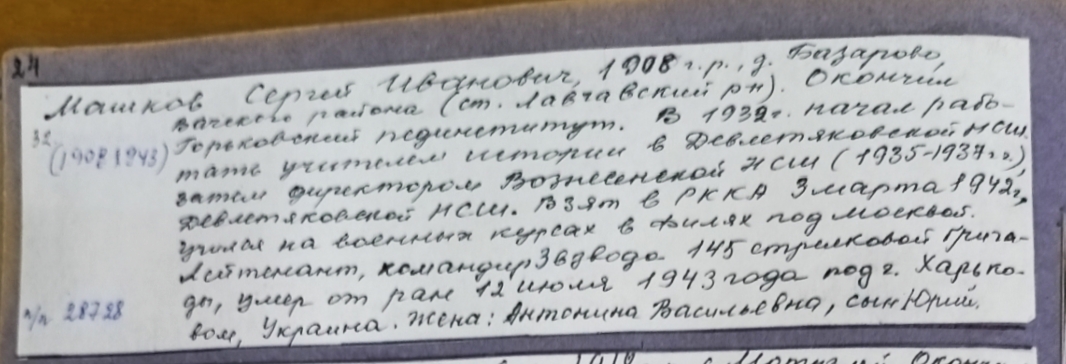 Машков Сергей Иванович, урож. д. Базарово, работал до войны учителем истории, директором Вознесенской средней школы примерно в 1935 году и далее Мотызлейской школы Вознесенского р-на Горьковской области.