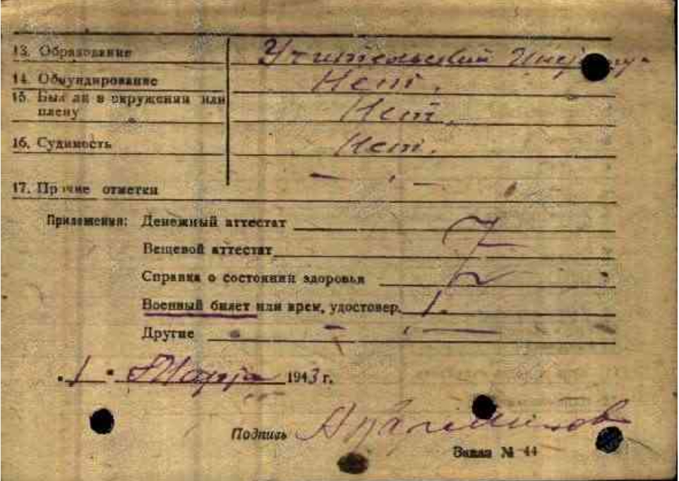 Направлен 01.03.1943 г. в 1-ю арт.бригаду.