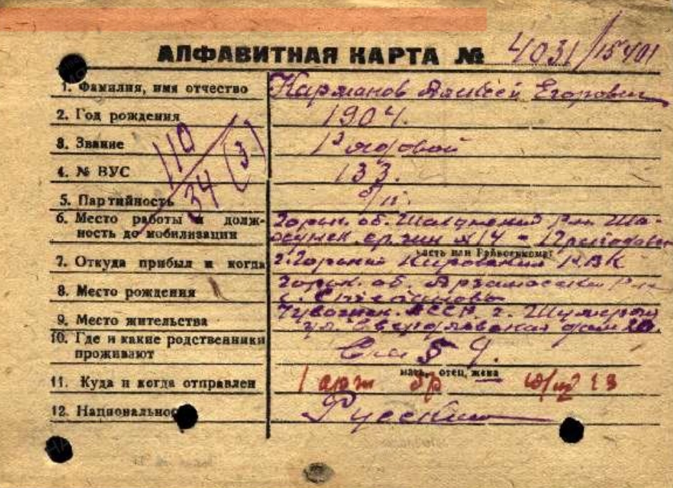Уроженец с Степаново Арзамасского р-на Горьковской обл., беспартийный, закончил Учительский институт, до призыва преподавал в г. Шахунья Горьковской обл. в средн. школе № 14.
