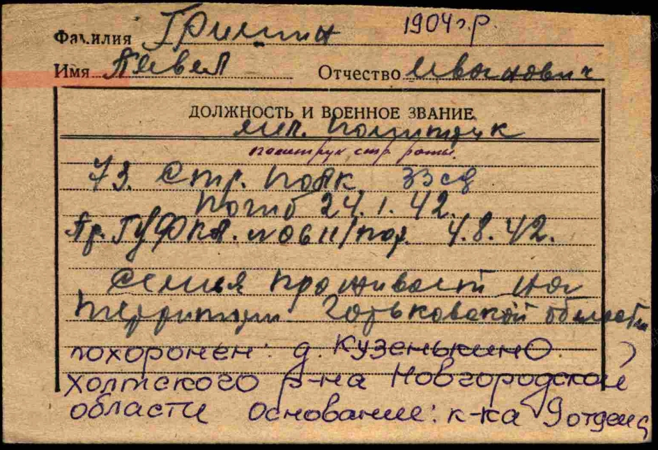 Первичное место захоронения: Калининская обл., Холмский р-н, д. Куземкино