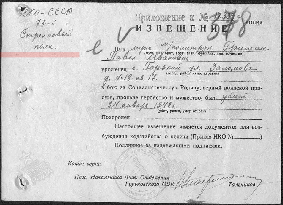 Наименование воинской части: 73 стрелковый полк 33 стрелковой дивизии