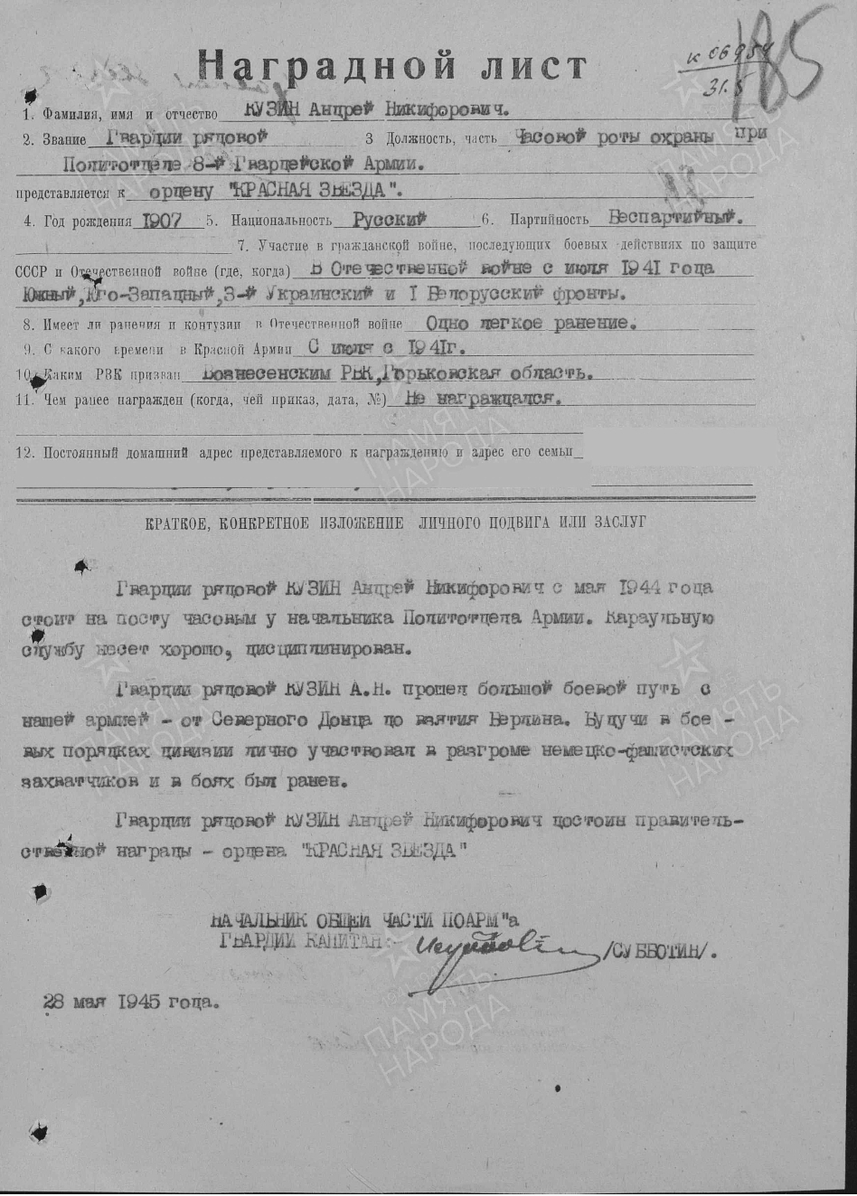 Предполагаю, что Кузины родом из Дашино Вознесенского р-на Горьковской обл.: Кузин Андрей Никифорович 1907 г.р. и Кузин Иван Никифорович 1920 г.р., — родные братья.