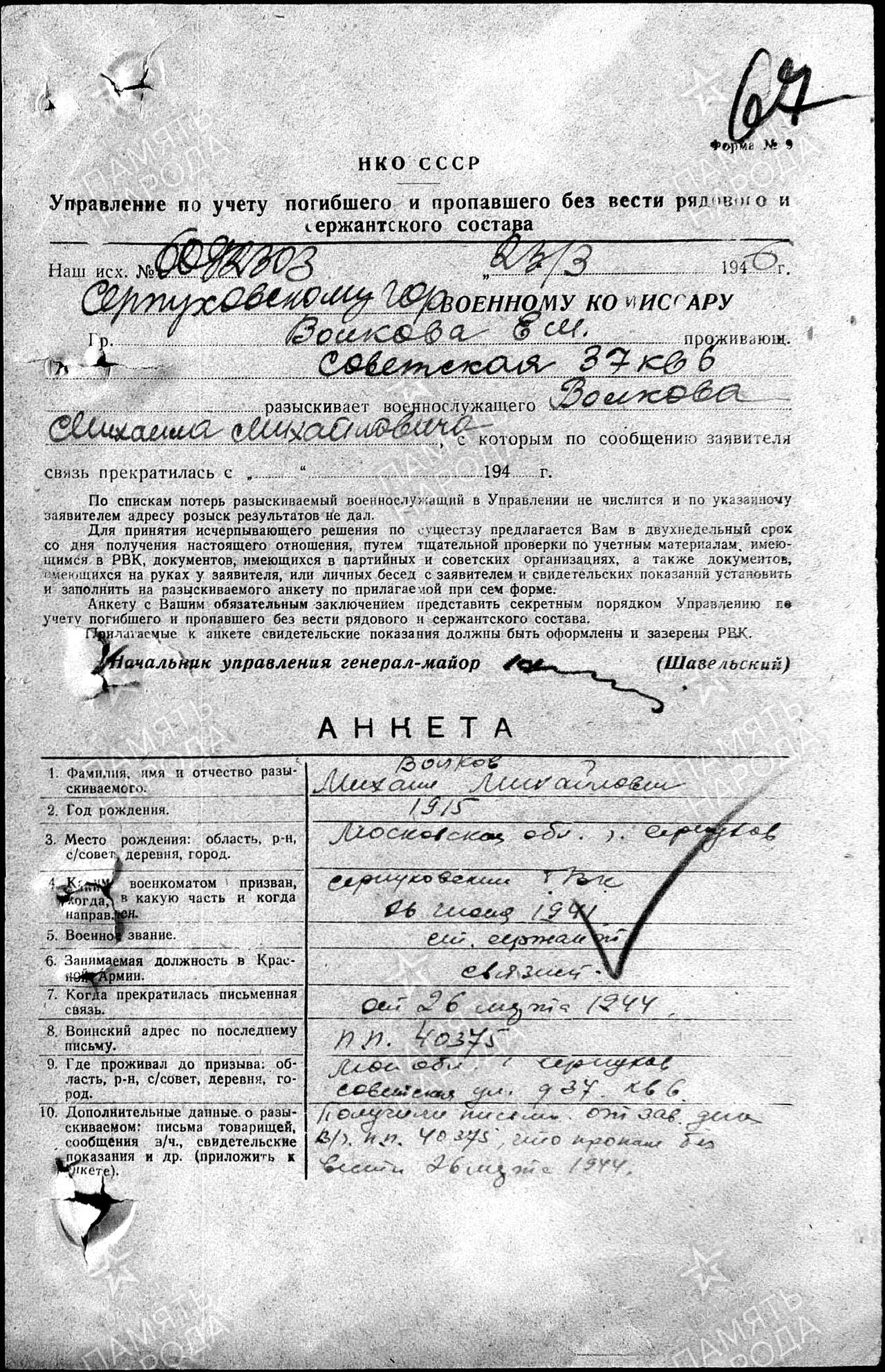 Дата призыва: 26.06.1941 Серпуховский ГВК, Московская обл.