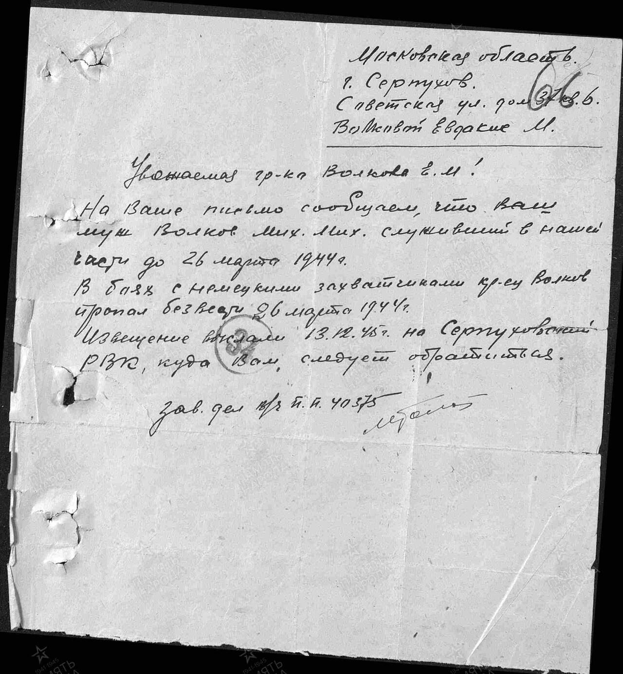 Из бригады, видимо по запросу родных пришел ответ только в конце 1945-го года
