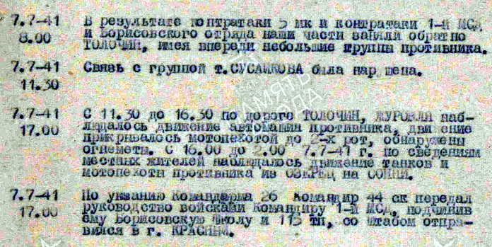 В течение недели, до 10 июля, дивизия отступала с боями вдоль шоссе Москва-Минск по направлению к Орше, сдерживая продвижение 18-й танковой дивизии вермахта к Смоленску. Когда 6 июля части вермахта овладели городом Толочин, было принято решение ударом выбить их из этого города. Силами 6-го и 175-го мотострелковых и 12-го танкового полков 1-й мотострелковой дивизии была разбита автоколонна противника, и город был очищен от немецких войск.