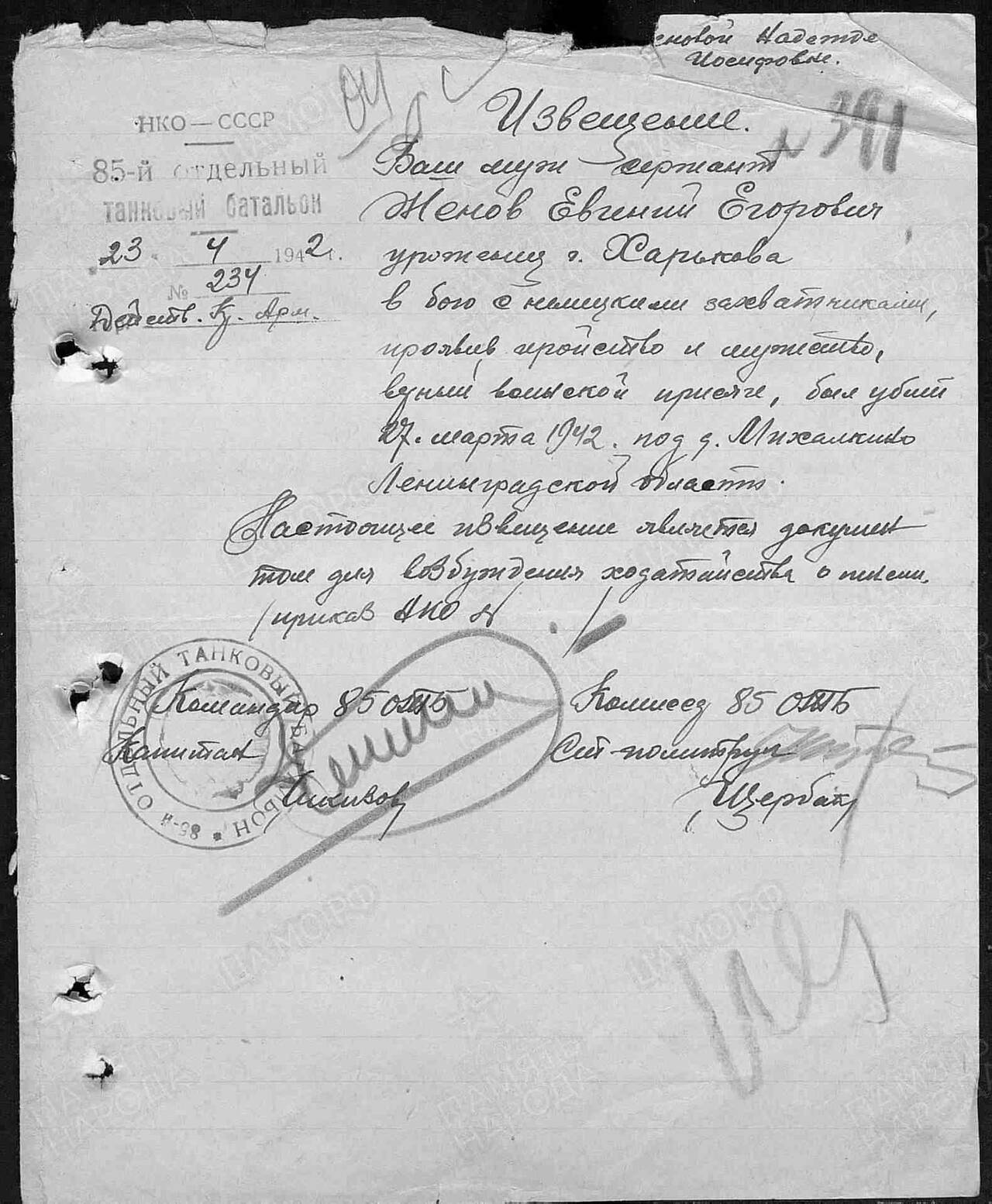 Не отправленное извещение Женовой Надежде Иосифовне в Харьков в апреле 1942-го.