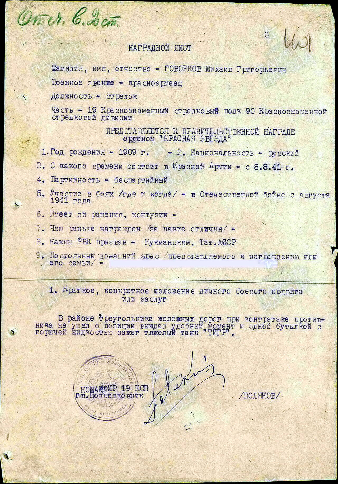 Солдат служил в роте автоматчиков 19-го стрелкового полка.