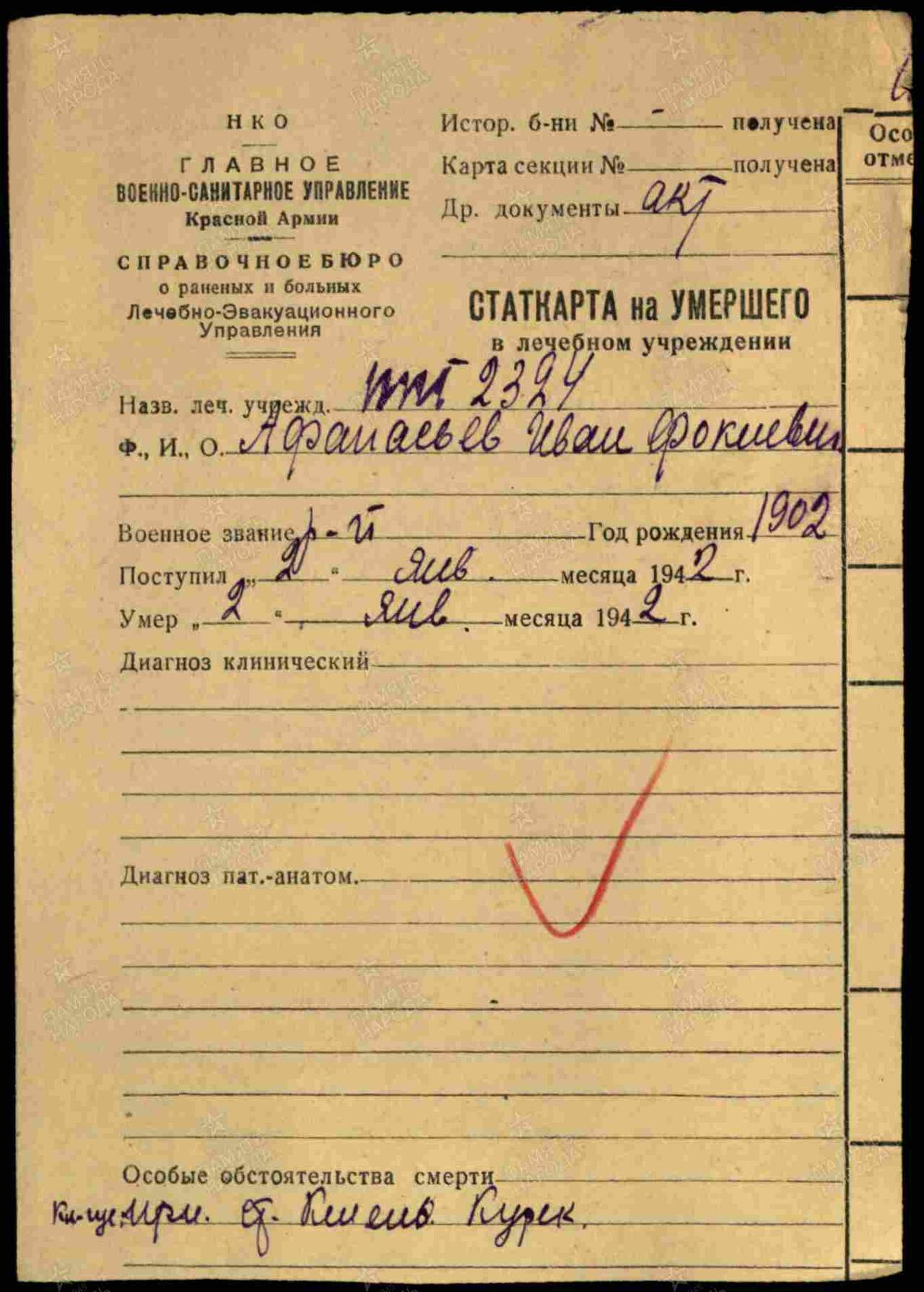 Первичное место захоронения: Курская обл., ст. Кшень, кладбище