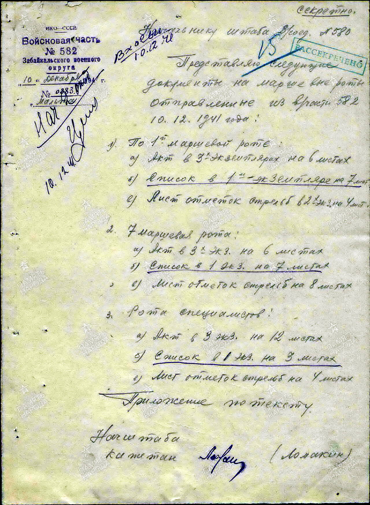 Титульный лист отправки маршевой роты 12 декабря 1941 года со станции Мальта