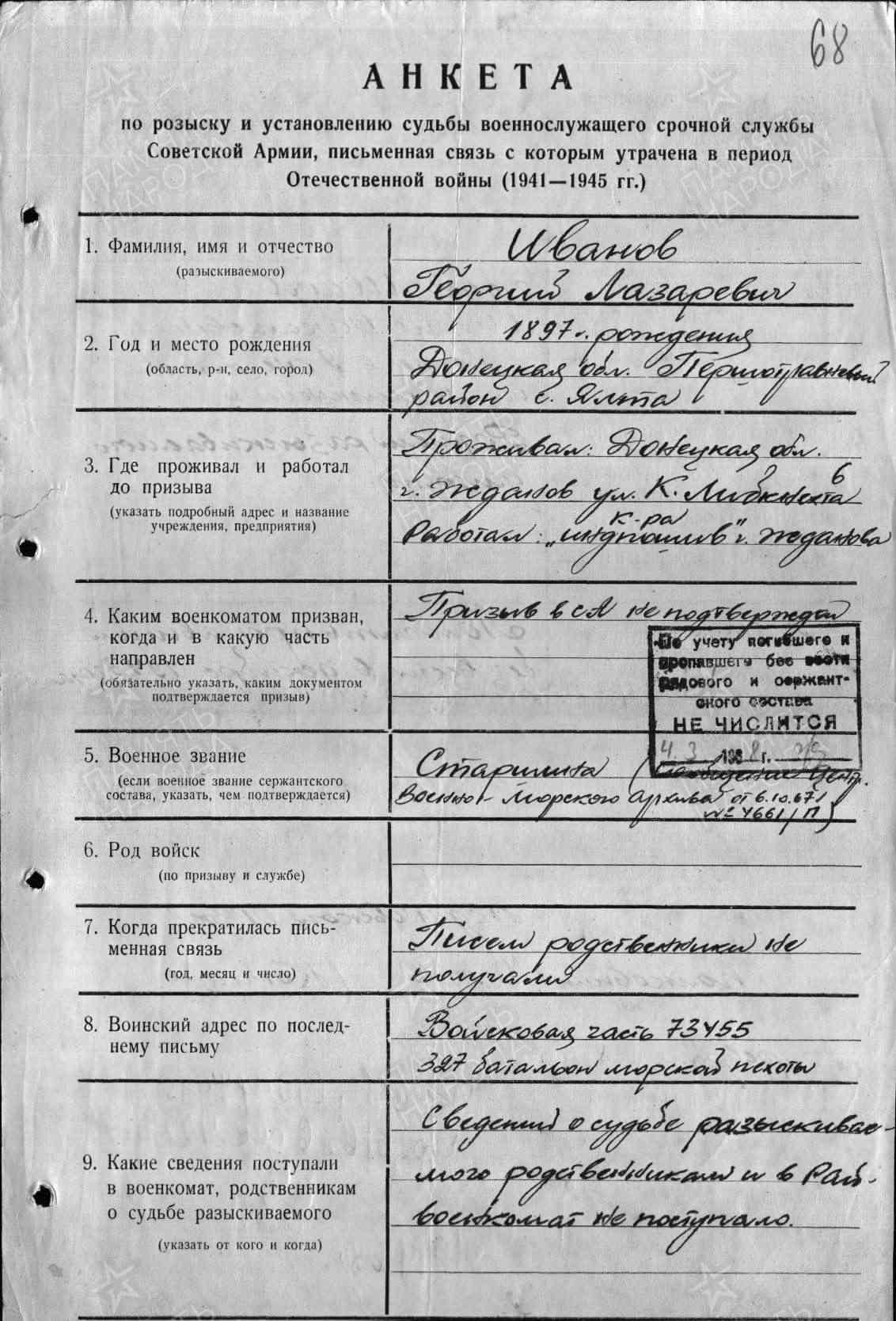 Последнее место службы: 327 бат. мор. пех.