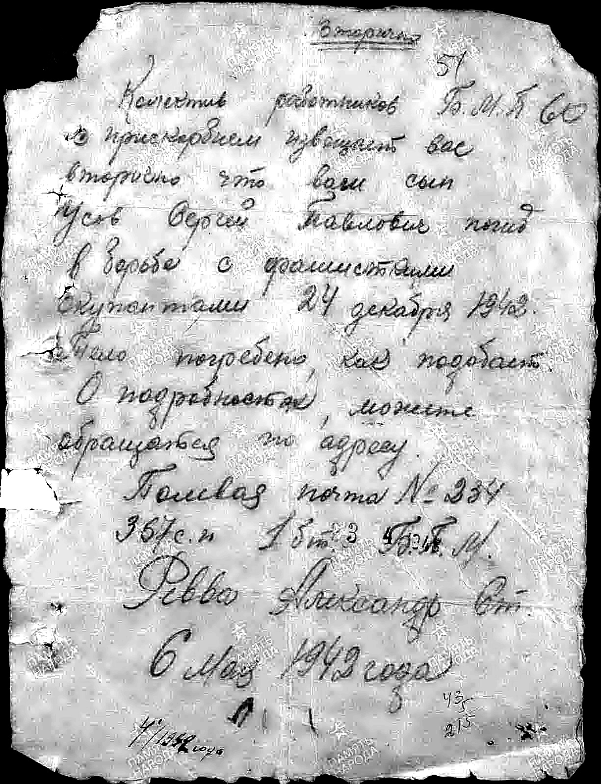 Не сразу бросилось в глаза, ошибка в письме, написано 6 мая 1942 , погиб 24 декабря 1942г.