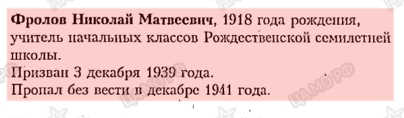 - Фролова Николая Матвеевича – красноармеец, уроженец в с. Спешнево Княгининского района. Пропал без вести в декабре 1941г. в 1939г. был взят на службу в Советскую Армию. Работал учителем в Рождественской начальной школе.