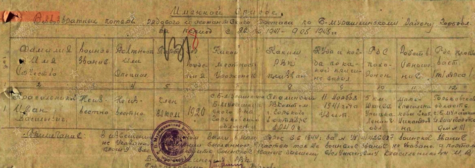 Дата призыва: Сталинский РВК, Горьковская обл., г. Горький, Сталинский р-н