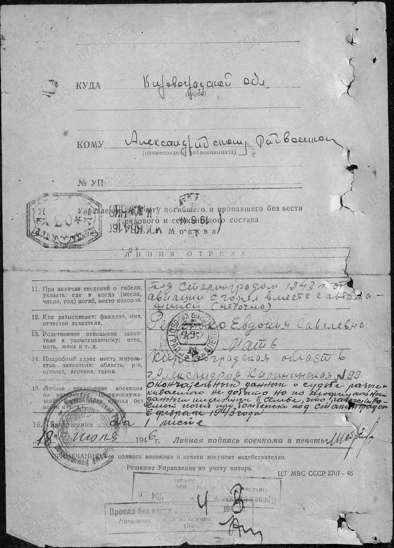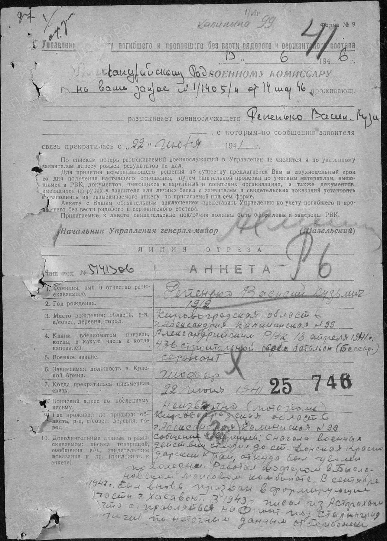 Дата призыва: 18.04.1941 Александрийский РВК, Кировоградская обл.