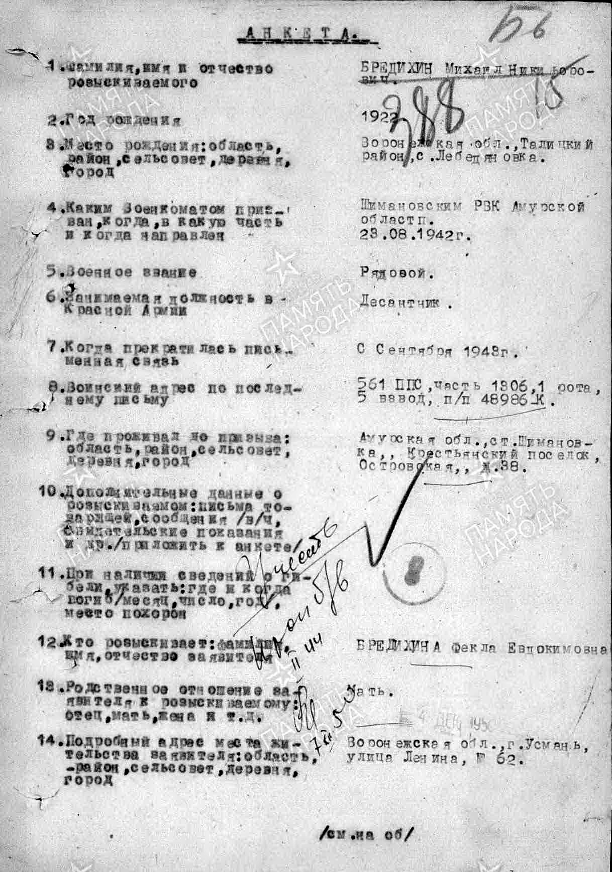 Последнее место службы: ппс 561 п/п 48986-к ч 1306 (569-й стрелковый полк 161 сд)