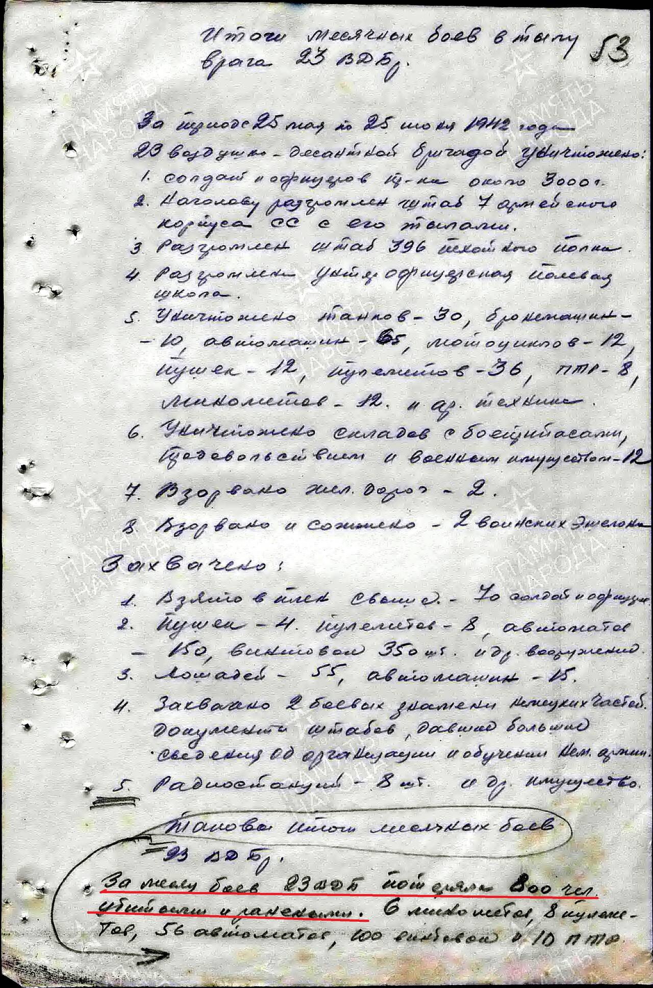 О боевых действиях 23-й воздушно-десантной бригады летом 1942-го в сети есть только " выжимка" из нижеприведенных документов, как пример здесь Ссылка