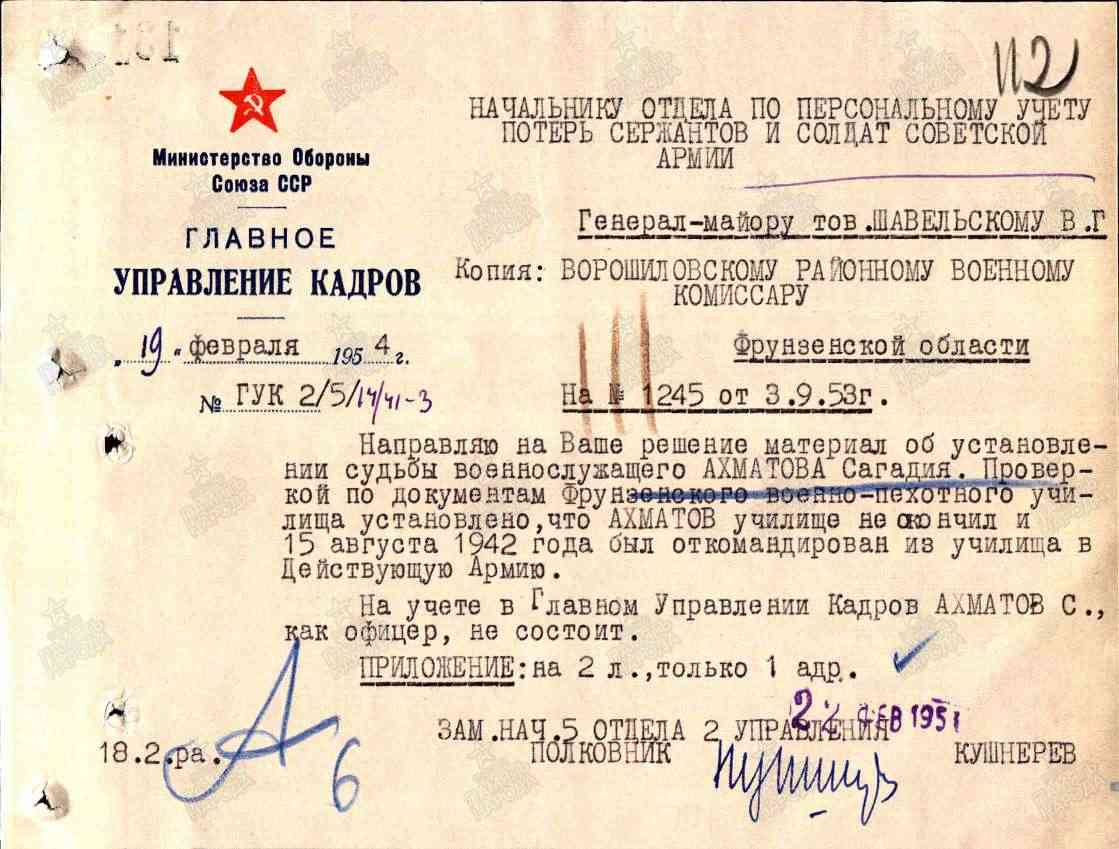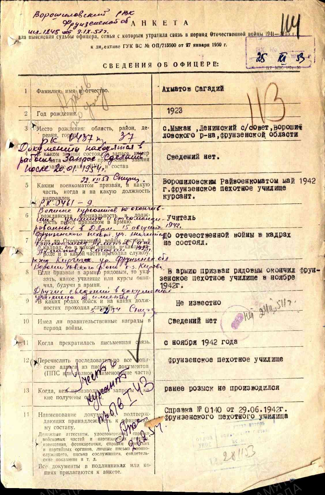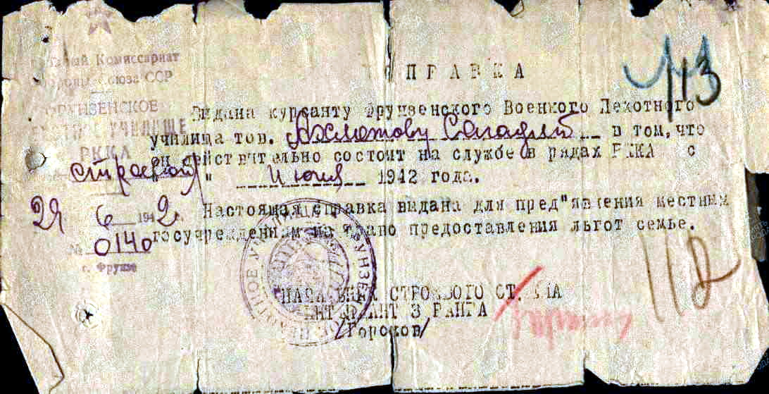 Дата призыва: Ворошиловский РВК, Киргизская ССР, Фрунзенская обл., Ворошиловский р-н