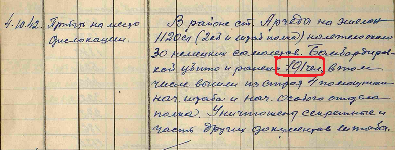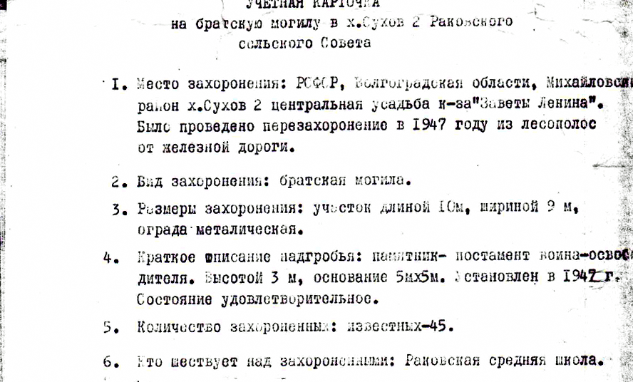Первичное место захоронения: Сталинградская обл., Михайловский р-н, ст. Раковка, 7 км, разъезд по направлению ст. Арчада, Сталинградская ж/д