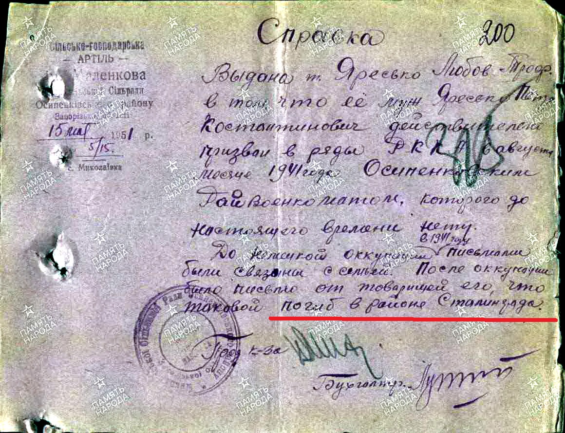 Дата призыва: Осипенковский РВК, Украинская ССР, Запорожская обл., Осипенковский р-н