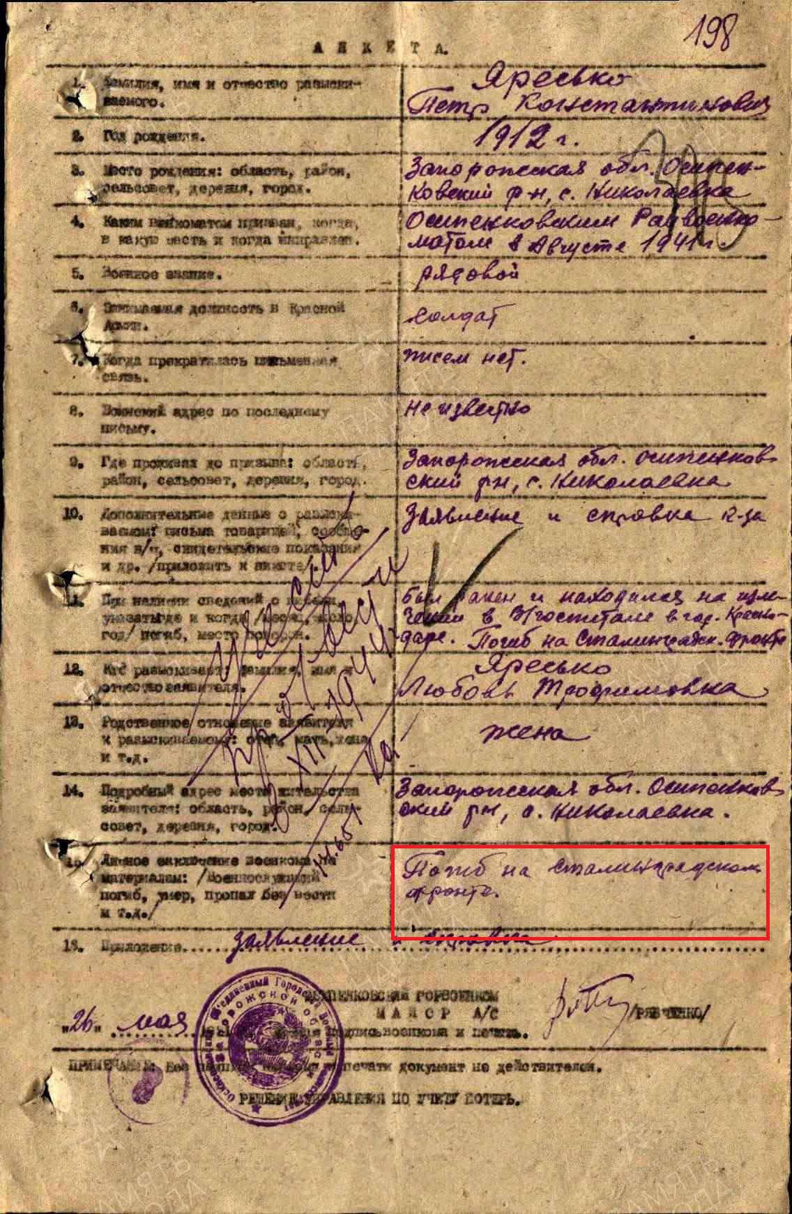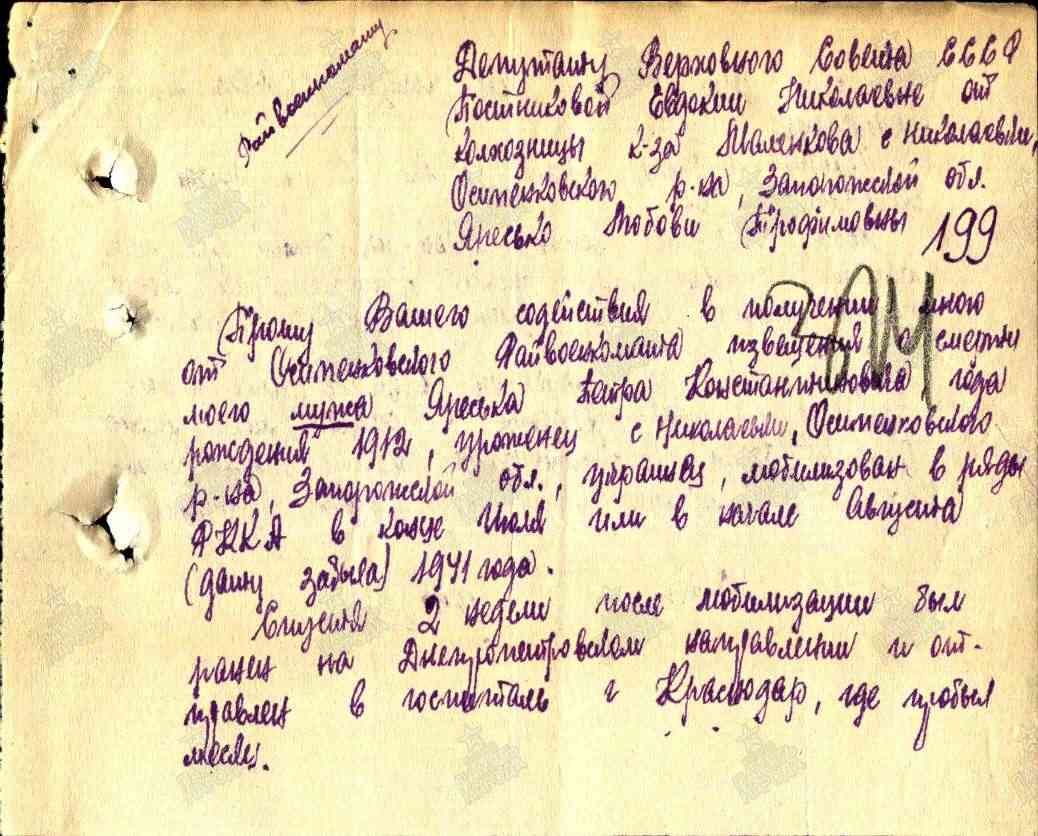 Дата призыва: __.08.1941 Осипенковский РВК, Украинская ССР, Запорожская обл., Осипенковский р-н