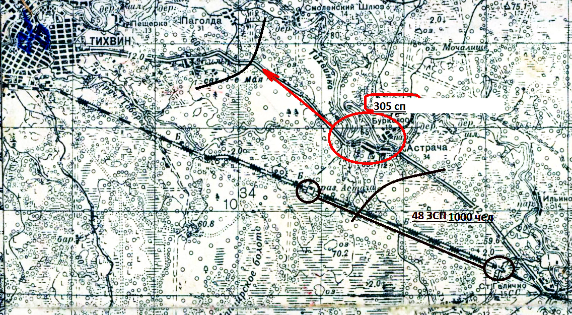 б) 305 СП - по дороге на Котелево до отм. 63.5 и по р. Сясь через Кострино, до отм. 52.7.