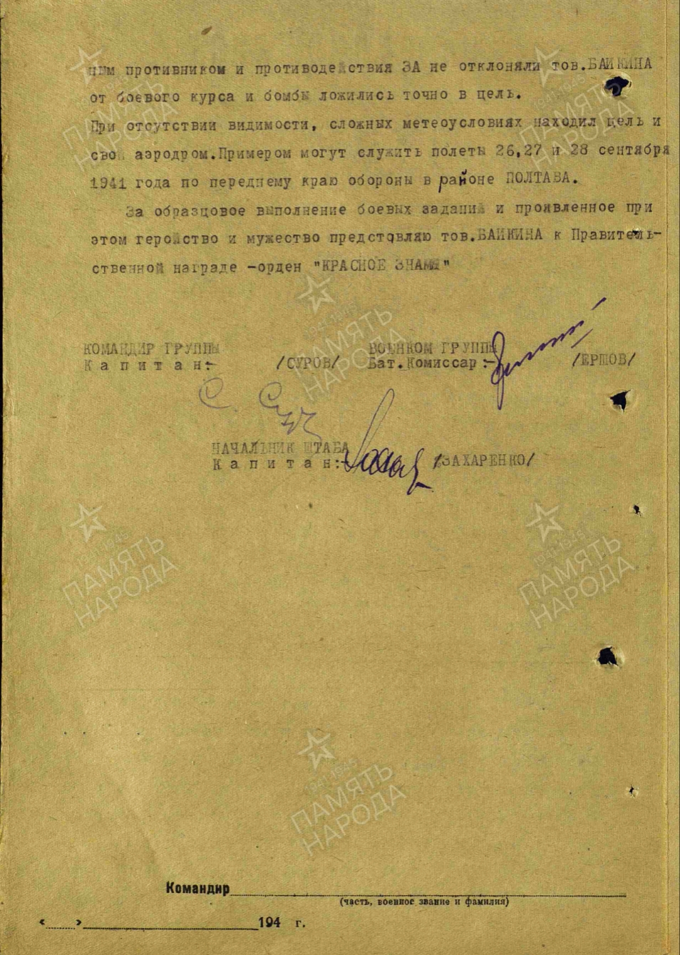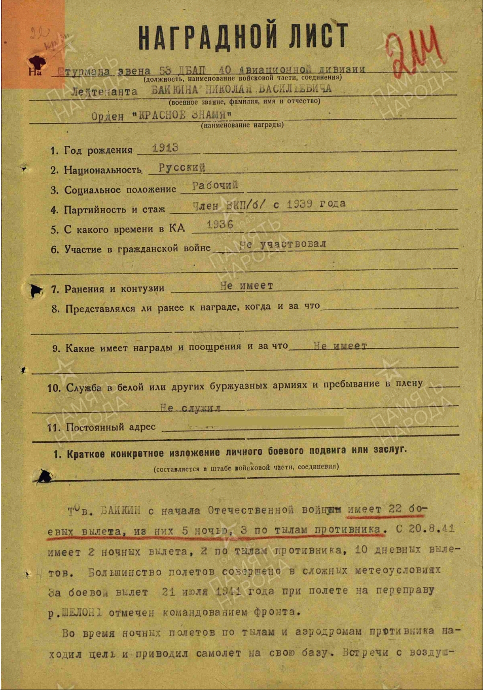 А мой прадед летал штурманом на бомбардировщике дальнего действия. Десятки раз он со своими товарищами обрушивал огненные залпы на вражеские силы в тылу врага. За боевые заслуги 23 февраля 1942 года он был награжден орденом «Красное знамя».24 апреля 1942 года вылетев на боевое задание самолет не вернулся. Николаю в то время было всего 27 лет. Долгих 5 лет шли розыски. Но ни среди живых, ни среди пленных или погибших его не нашли. В 1947 г. вышел приказ считать старшего лейтенанта Баикина Николая Васильевича без вести пропавшим. Но в памяти нашей семьи он вечно живой. Мы бережно храним его фотографии и письма с фронта.