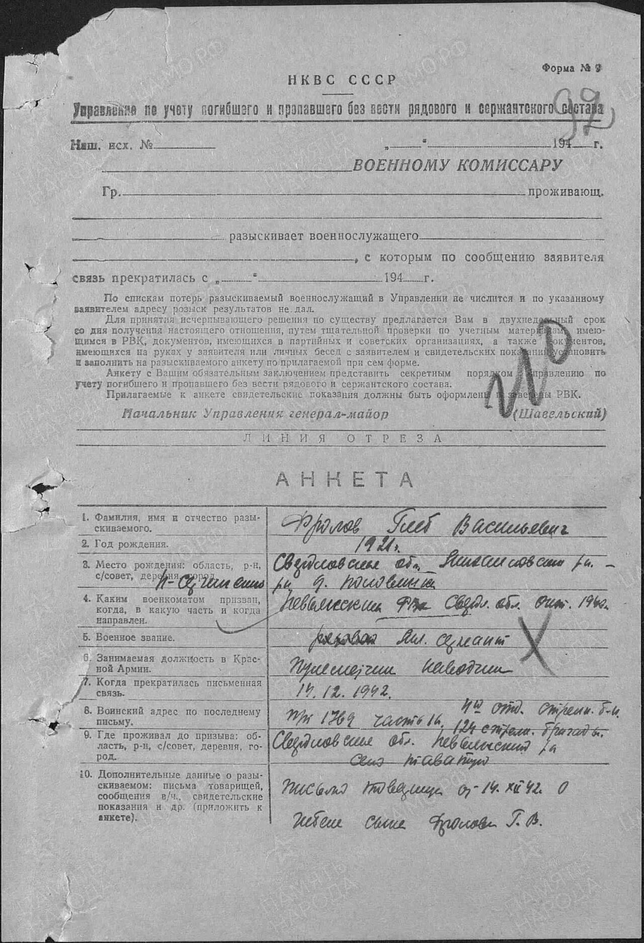 Родной брат моей бабушки Глеб Васильевич родился в мае 1921г в деревне Половинки Нижне-Сергинкого района Свердловской области . В 1940г был призван в армию, служил на Дальнем Востоке.
