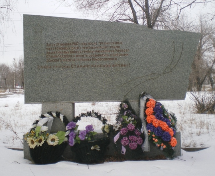 «Здесь 24 ноября 1942 года после трехмесячных ожесточенных боев с немецко-фашистскими захватчиками войска группы полковника Горохова Сталинградского фронта соединились с войсками Донского фронта генерала Рокоссовского. Слава героям Сталинградской битвы».