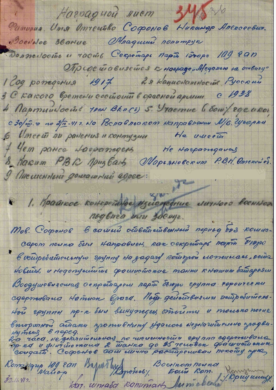 Служил так же мл.политруком в одном (109 гап) полку и награждены в одном Приказе тоже Орденом Красной Звезды с мл.политруком штабной батареи Яровым Сергеем Никитичем (1918-1942)