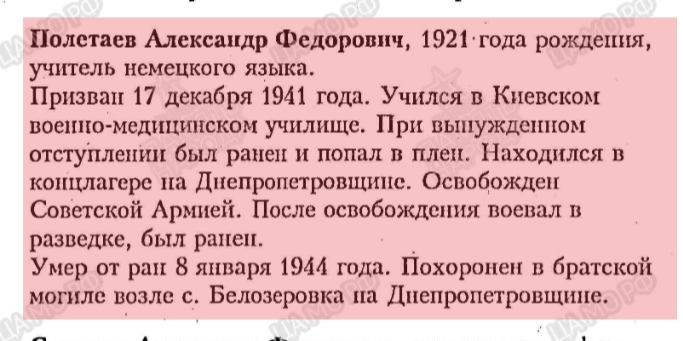 1942г… Израненная днепропетровская земля. Вынужденное отступление Советской армии. Часть, в которой служил А. Ф. Полетаев, попала в окружение. Солдаты бились до последнего патрона. Многие полегли в этих боях, пулевое ранение получил и Александр. Неизвестно, сколько лежал он без памяти, очутился в немецком плену. С раннего утра до позднего вечера гоняли на изнурительные работы. Конвоиры издевались, били, стреляли за малейшую «провинность». Лютая ненависть к фашизму овладела им.
