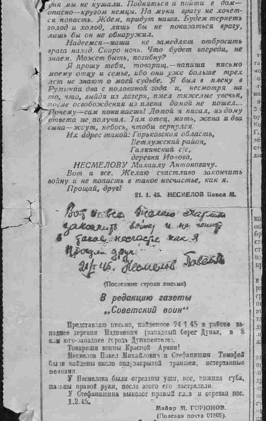 Я прошу тебя, товарищ, напиши письмо моему отцу и семье. Я был в плену в Румынии два с половиной года и, несмотря на то что, выйдя из лагеря, имел тяжелые увечья, после освобождения из плена домой не пошел... Домой я писал, из дому ответа не получил. Там отец, мать, жена и два сына, ждут, небось, чтобы вернулся. Их адрес такой: Горьковская область, Ветлужский район, Галкинский сельсовет. Несмелову Михаилу Антоновичу.