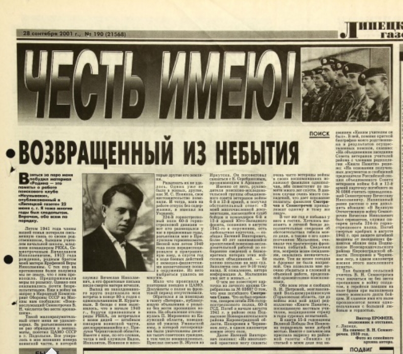https://opac.lib48.ru/images/newspapers … HTML/1073/ — по данной ссылке открывается страница Липецкой газеты, где есть очерк полковника в отставке Виктора Ерофеева за 2001 год «Возвращённый из небытия» о Вячеславе Николаевиче Семиотрочеве. Там можно увеличить скан для лучшего прочтения.