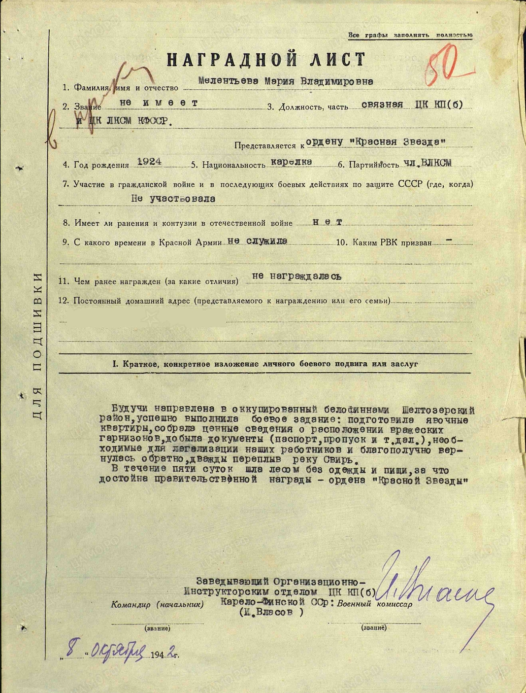 За доставку ценных документов связная ЦК ЛКСМ КФССР М. В. Мелентьева награждена 08.10.1942 г. Орденом Красной Звезды — Ссылка
