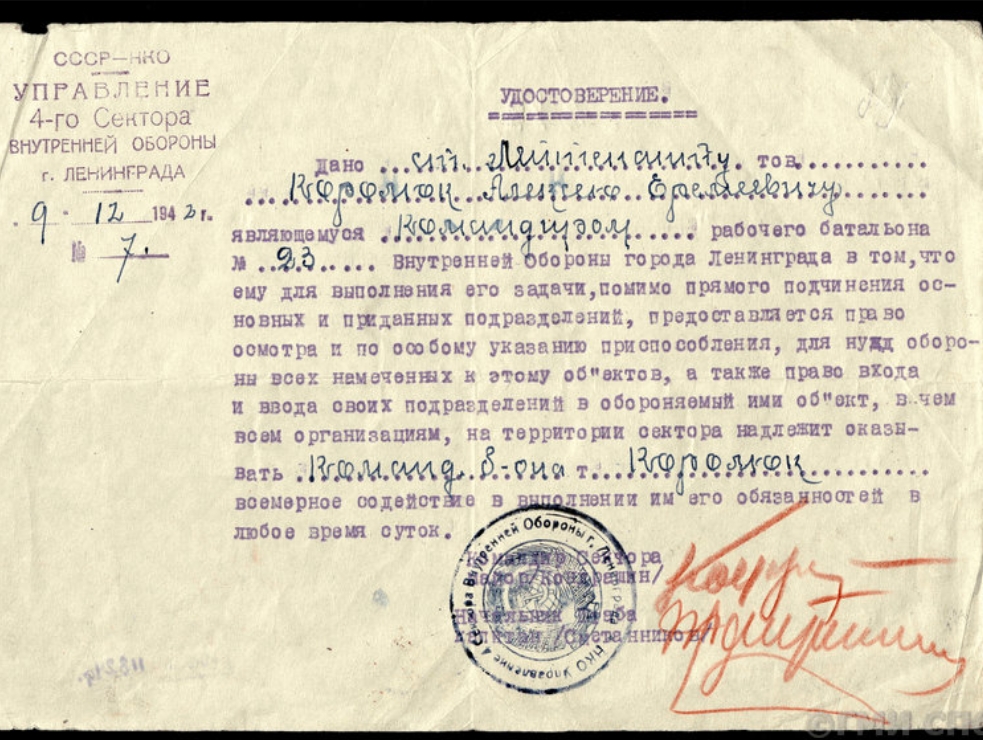 Удостоверение, что ст. лейтенант Алексей Еремеевич Королюк назначен в декабре 1942-го командиром 23-го батальона по обороне Ленингра да: