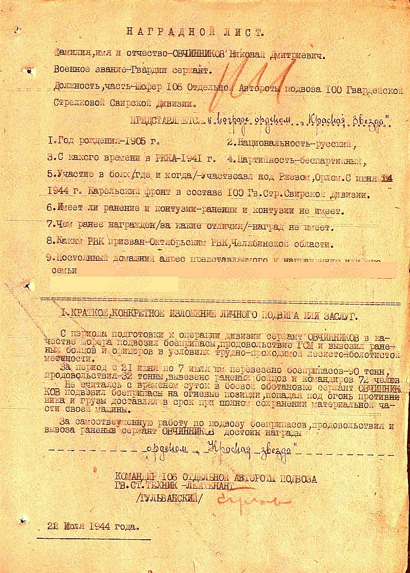 Наградой лист. от 22.07.1944 г.
