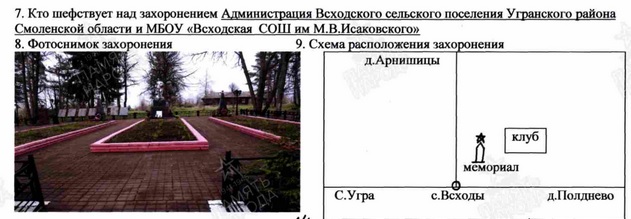 Место захоронения: Угранский р-н, с. Всходы, центр, кладбище