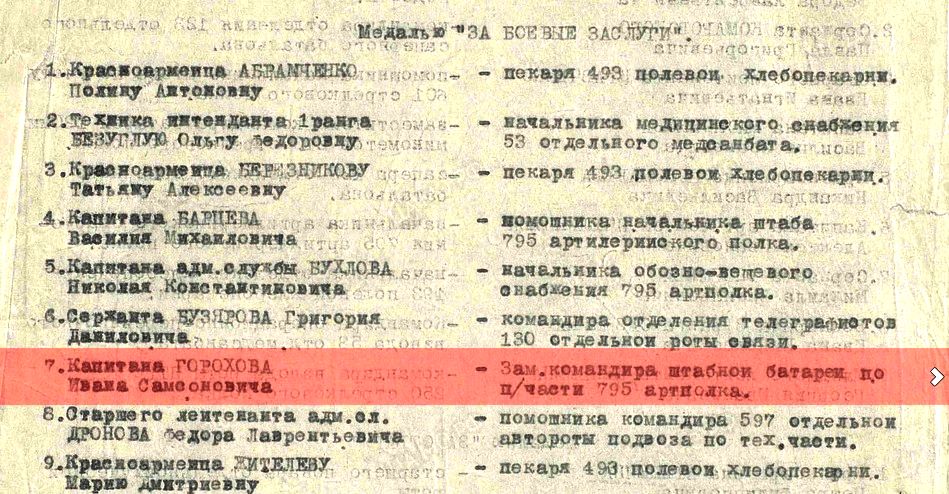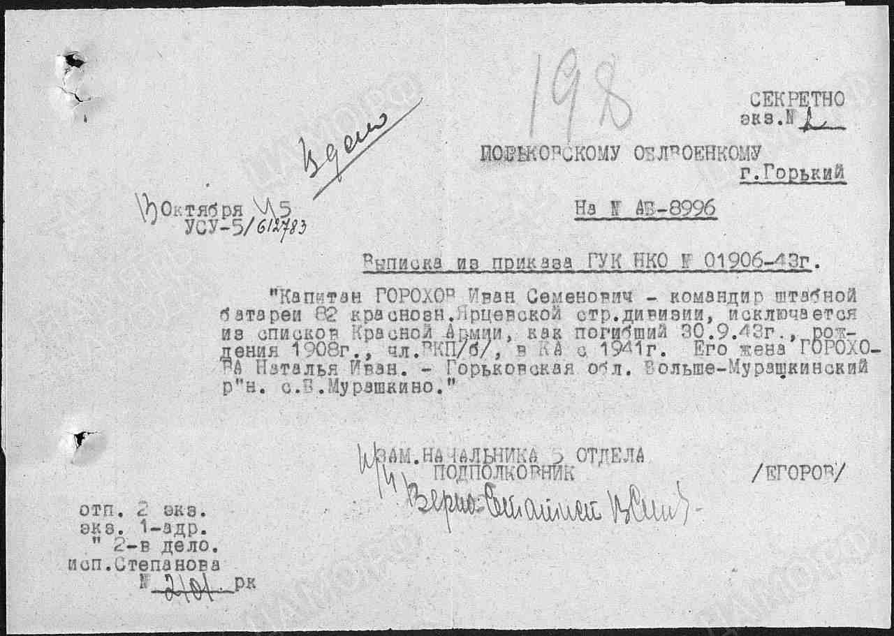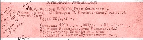 Капитан-артиллерист Горохов Иван Самсонович погиб в бою 30 сентября 1943 года. Похоронен в деревне Бодуны Смоленской области.