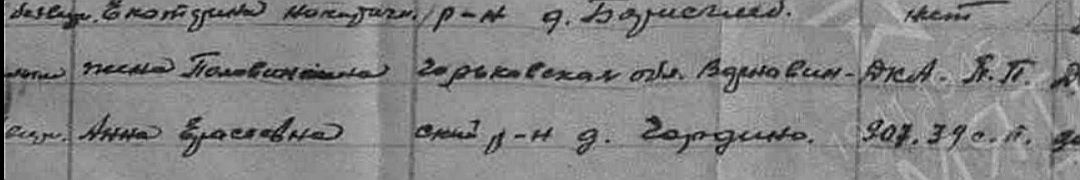 В его строке сказано со слов жены Анны Ерасьевны, что последнее известие от мужа от 01.06.1942.года с ппс 907, часть 39 сп.