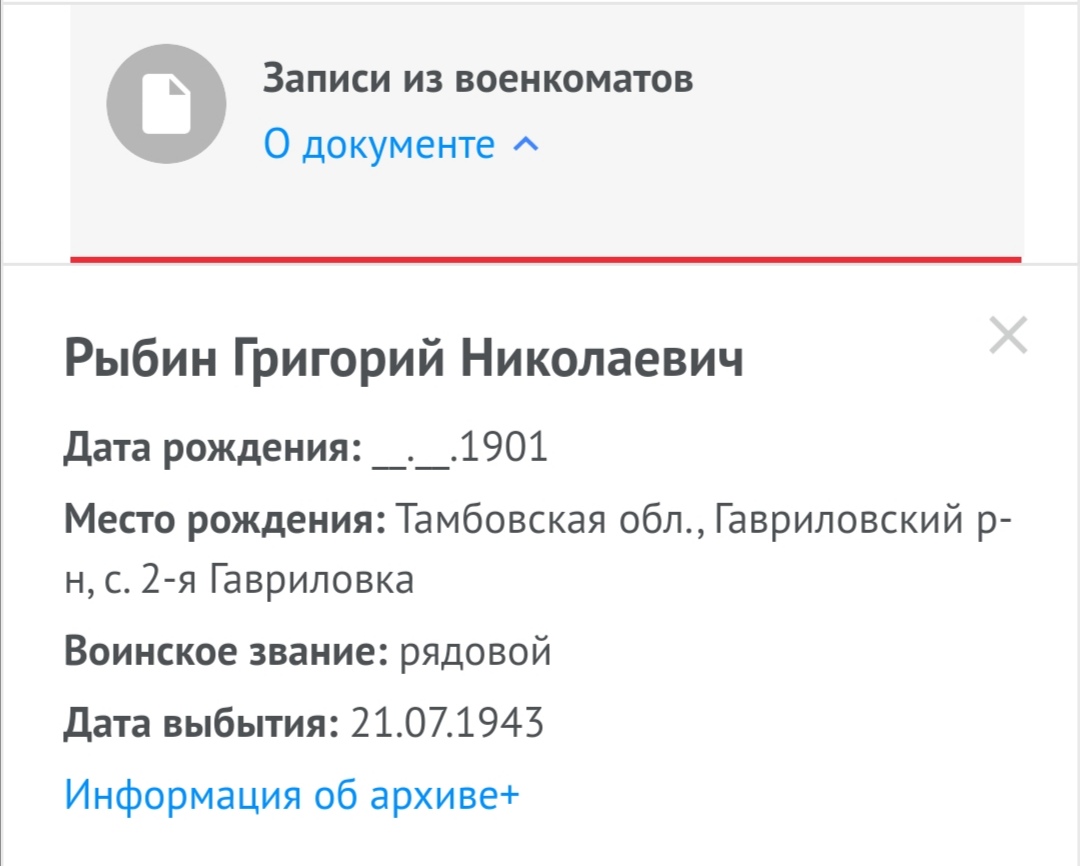 О красноармейце Рыбине Григорие Никитовиче (Никитич, Николаевич) 1900-1901 года рождения, уроженца с. 2-я Гаврилова Тамбовской обл. есть информация из его части с описанием его героический самоотверженной борьбы с фашистами - Сожжены заживо.