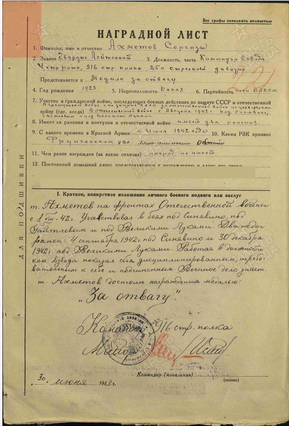 44. Ахметов Сыргавы Ахметович 1923, л-т, ком. роты 916сп, 250сд,35ск,63А